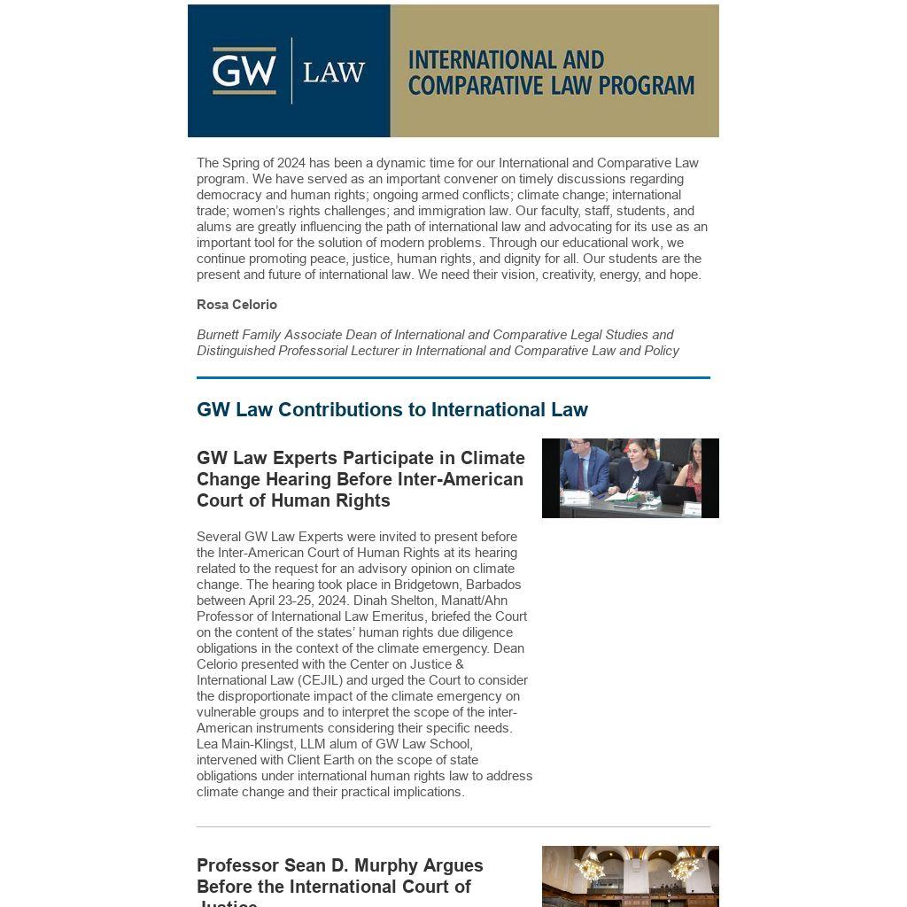The Spring of 2024 has been a dynamic time for our International and Comparative Law program. We have served as an important convener on timely discussions regarding democracy and human rights; ongoing armed conflicts; climate change; international trade; women’s rights challenges; and immigration law. Our faculty, staff, students, and alums are greatly influencing the path of international law and advocating for its use as an important tool for the solution of modern problems. Through our educational work, we continue promoting peace, justice, human rights, and dignity for all. Our students are the present and future of international law. We need their vision, creativity, energy, and hope.