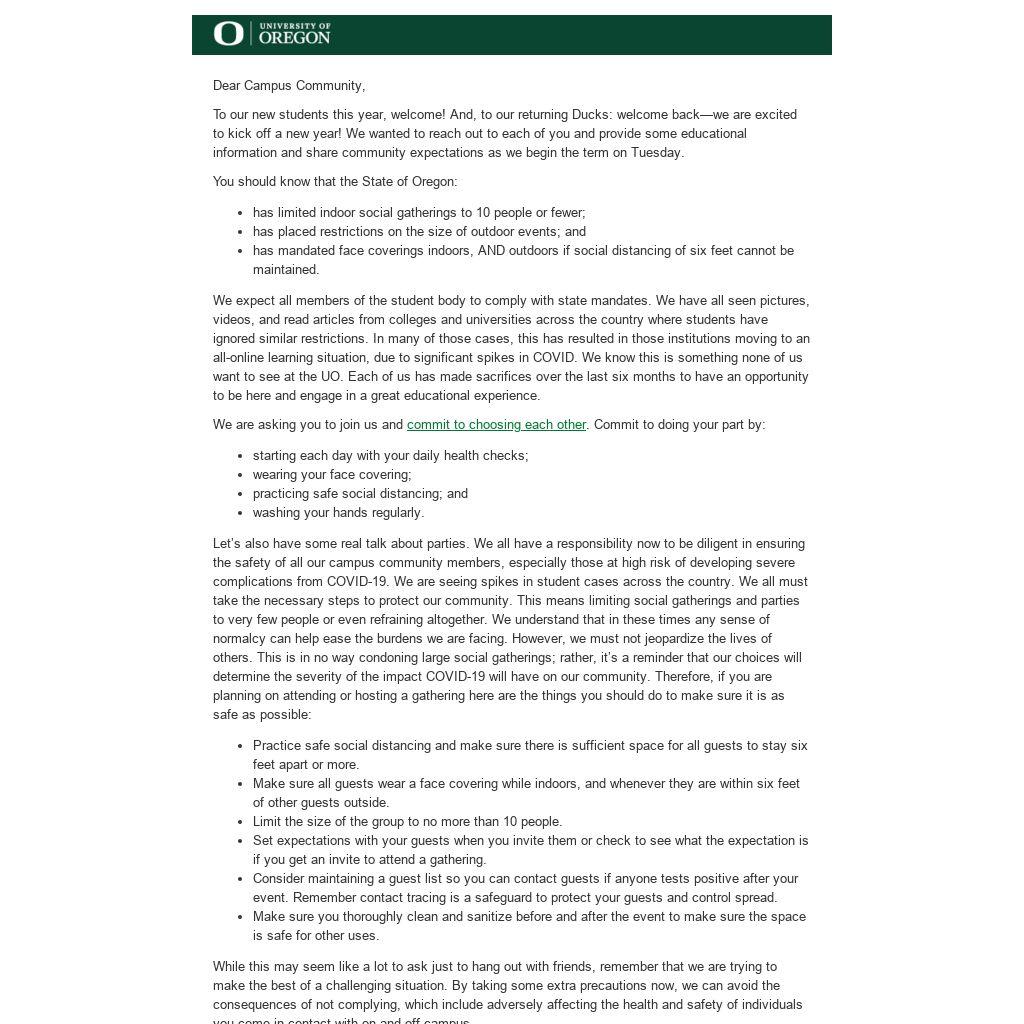 We expect all members of the student body to comply with state mandates. We have all seen pictures, videos, and read articles from colleges and universities across the country where students have ignored similar restrictions. In many of those cases, this has resulted in those institutions moving to an all-online learning situation, due to significant spikes in COVID. We know this is something none of us want to see at the UO. Each of us has made sacrifices over the last six months to have an opportunity to be here and engage in a great educational experience.