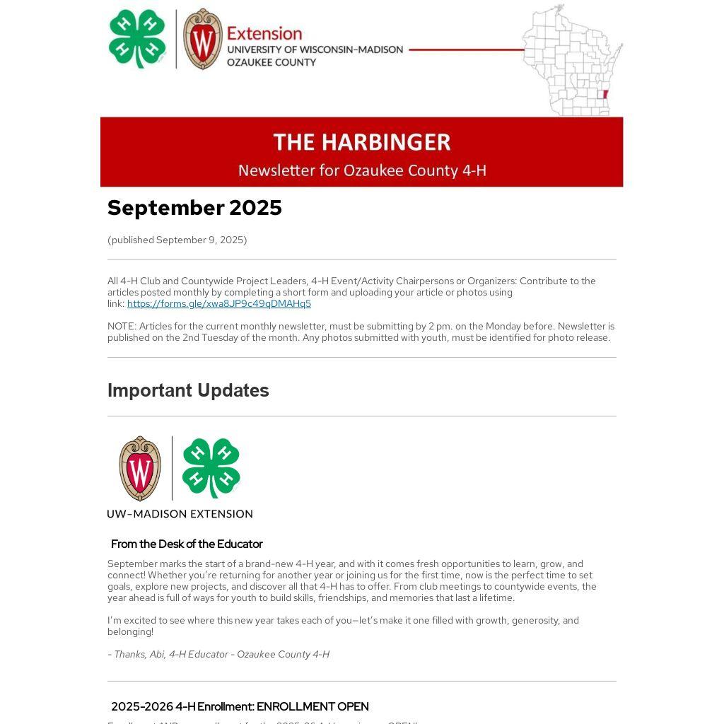 4-H Open Houses: September 9 & September 10. Do you know someone who wants to learn more about the Ozaukee County 4-H Program? Or perhaps they are ready to enroll in the 2025-2026 4-H Year? Invite them to an upcoming 4-H Open House!