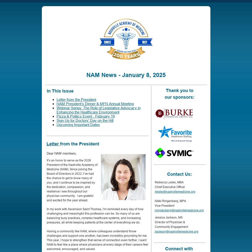 I’m also looking forward to continuing our partnership with the Medical Foundation of Nashville including programs like Project Access Nashville Specialty Care and PROSPER. I encourage you to stay involved however you can, join us at events, share your ideas, or invite a colleague who might benefit from being part of this community. NAM is at its best when we’re connected.