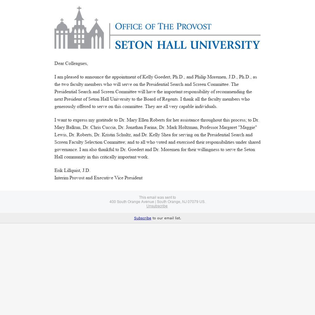 I am pleased to announce the appointment of Kelly Goedert, Ph.D., and Philip Moremen, J.D., Ph.D., as the two faculty members who will serve on the Presidential Search and Screen Committee. The Presidential Search and Screen Committee will have the important responsibility of recommending the next President of Seton Hall University to the Board of Regents. I thank all the faculty members who generously offered to serve on this committee. They are all very capable individuals.