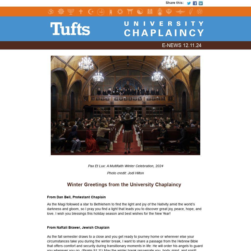 The University Chaplaincy is a dynamic hub supporting religious, spiritual, ethical, and cultural life for all members of the Tufts community. We provide spiritual care, support religious and philosophical communities, educate about spiritual and ethical issues in society and the world, and promote multifaith engagement.