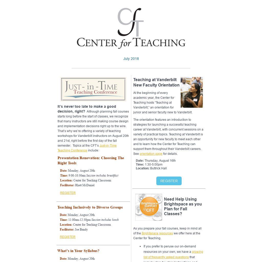 | Teaching at Vanderbilt New Faculty Orientation At the beginning of every academic year, the Center for Teaching hosts “Teaching at Vanderbilt,” an orientation for junior and senior faculty new to Vanderbilt. The orientation features an introduction to strategies for launching a successful teaching career at Vanderbilt, with concurrent sessions on a variety of practical topics. Teaching at Vanderbilt is an opportunity for new faculty to meet each other and to learn how the Center for Teaching can support them throughout their Vanderbilt careers. See orientation page for details. Date: Thursday, August 16th