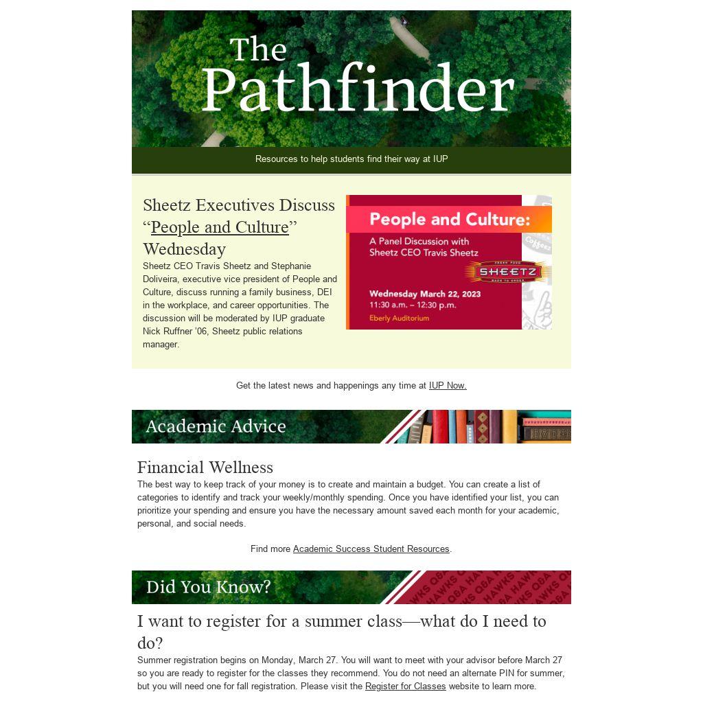 The IUP CPDC’s next installment of its Career Ready Seminar Series will be held Monday, March 27, at 6:00 p.m. in the Great Room in Elkin Hall and will be presented by IUP alumna and trustee Laurie Kuzneski. This informative discussion will cover company culture and how to determine if a company is the right fit for you.