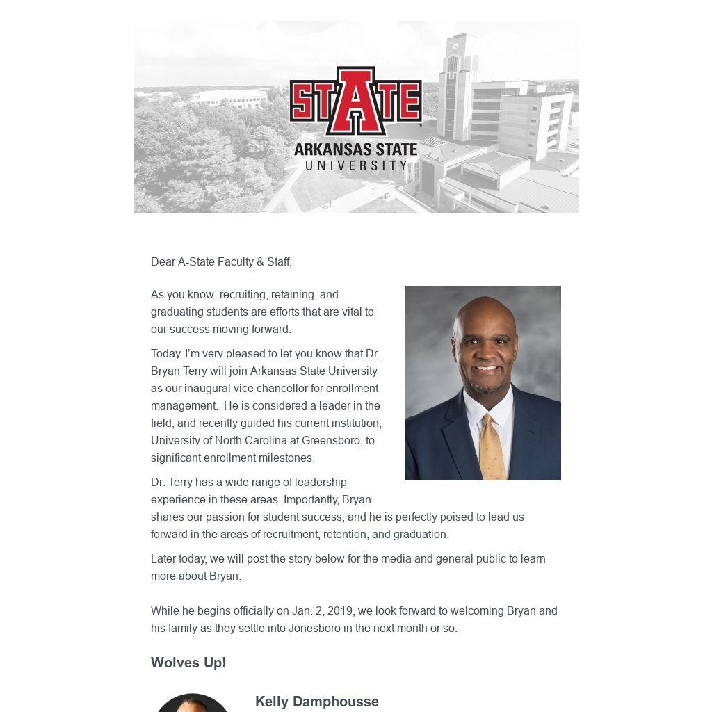 “I am very excited about bringing Dr. Terry to Jonesboro,” Damphousse said. “He has a wide range of leadership experience in the areas that we as a campus have decided are vital to our future. Importantly, Bryan shares with our campus community a passion for student success, and he is perfectly poised to lead us forward in the areas of recruitment, retention and graduation.”