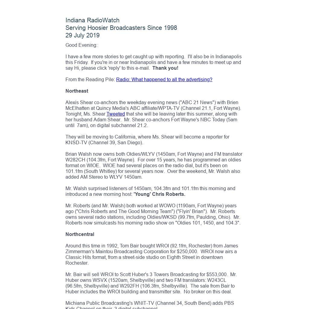 Indiana RadioWatch subscriptions are free. To subscribe, send an e-mail to irw@well.com and we'll add you. After publication, we archive Indiana RadioWatch on the Indiana Radio Archive at http://www.indianaradio.net. Please e-mail us your news stories and employment opportunities.