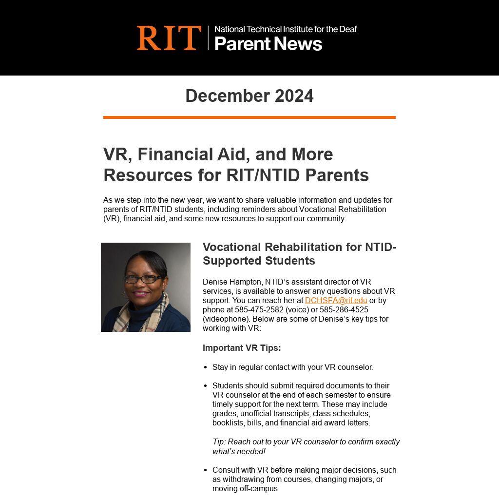 As we step into the new year, we want to share valuable information and updates for parents of RIT/NTID students, including reminders about Vocational Rehabilitation (VR), financial aid, and some new resources to support our community.