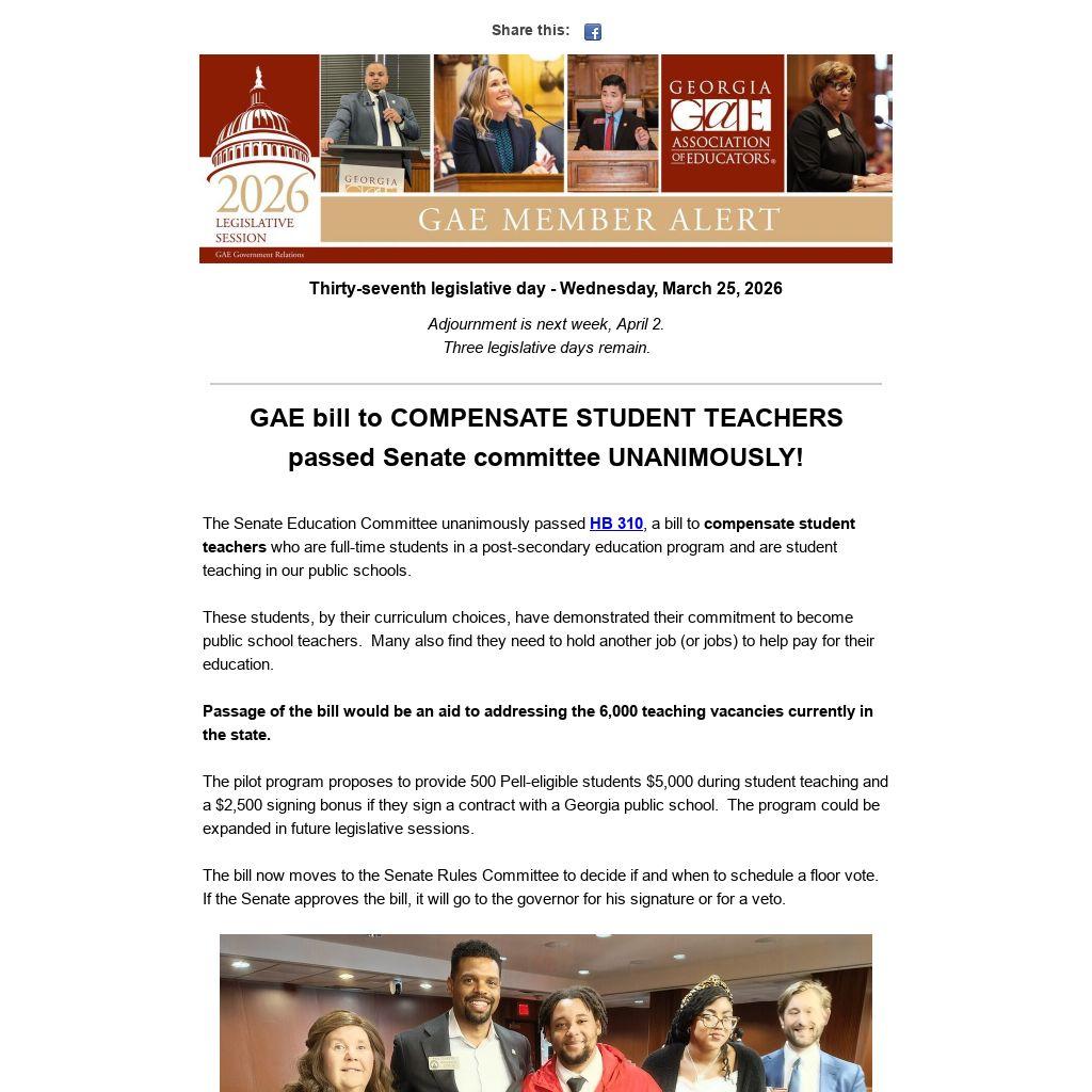 While GAE would prefer additional changes to the bill to expand educator eligibility, it does extend the sunset date from to 2030 and allows the Georgia Department of Education, in consultation with the Professional Standards Commission (PSC), to determine the eligible "in demand" subject areas that an educator must qualify to enroll in the program.