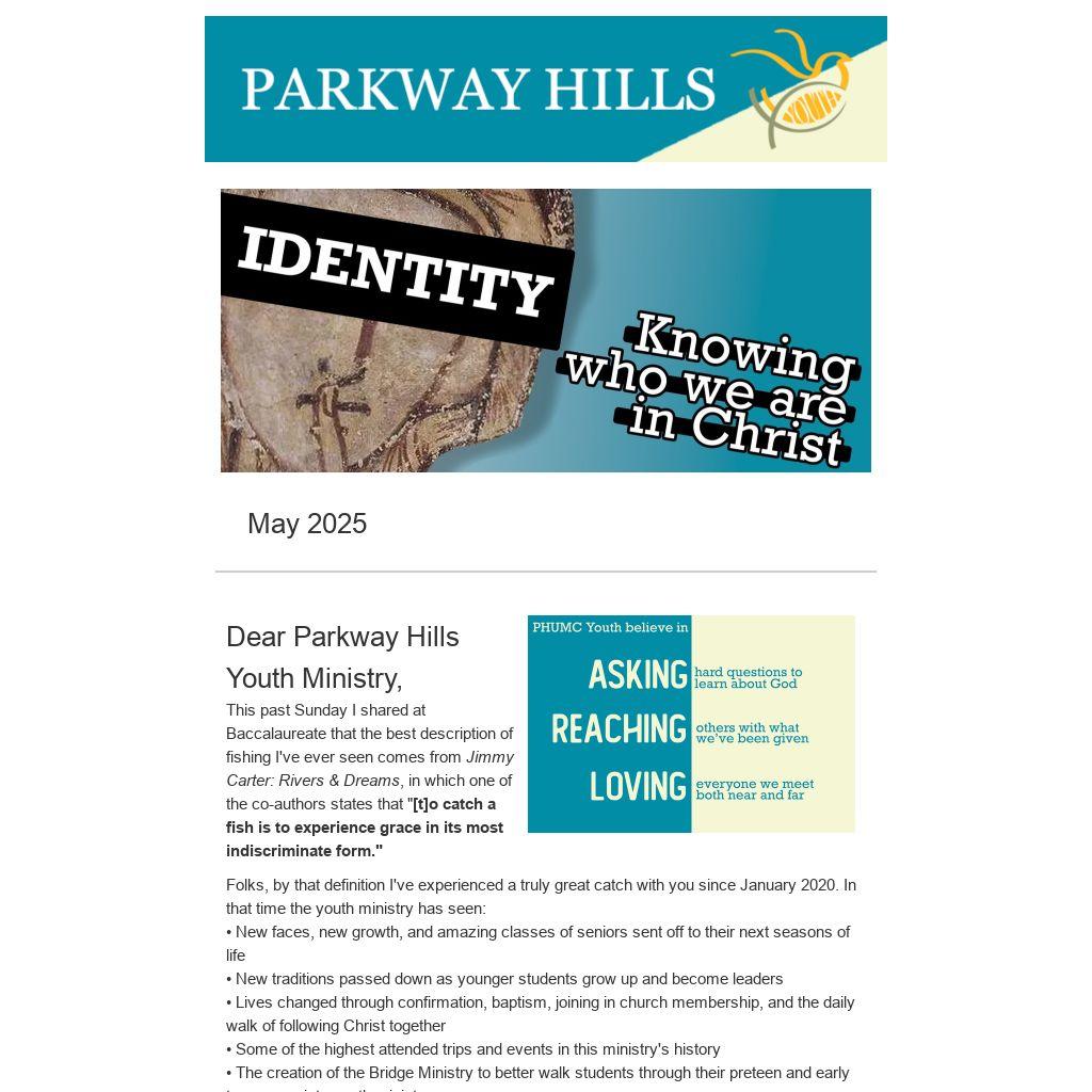 One of my prayers for Parkway Hills is that any legacy I leave creates the opportunity to outdo my legacy because we serve a God who is in the business of making sure the best fish stories aren't just in the past. That's why I want to strongly encourage every one of you, adults and youth included, to show up this Wednesday, May 7, for the PHUMC Mission & Ministry Evening at 6pm in the Garden Room. A light dinner will be served and a nursery is available by requestion. With so much change coming to PHUMC this summer I believe it's important for you all to have a voice in dreaming together, which is why we aren't holding any other events that night that could pull away adult volunteers or teens.