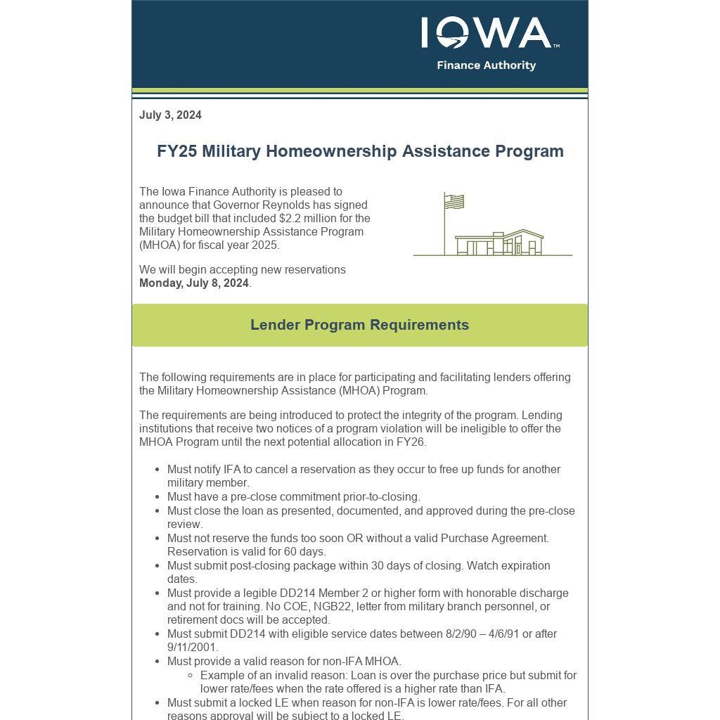 The Iowa Finance Authority is pleased to announce that Governor Reynolds has signed the budget bill that included $2.2 million for the Military Homeownership Assistance Program (MHOA) for fiscal year 2025.