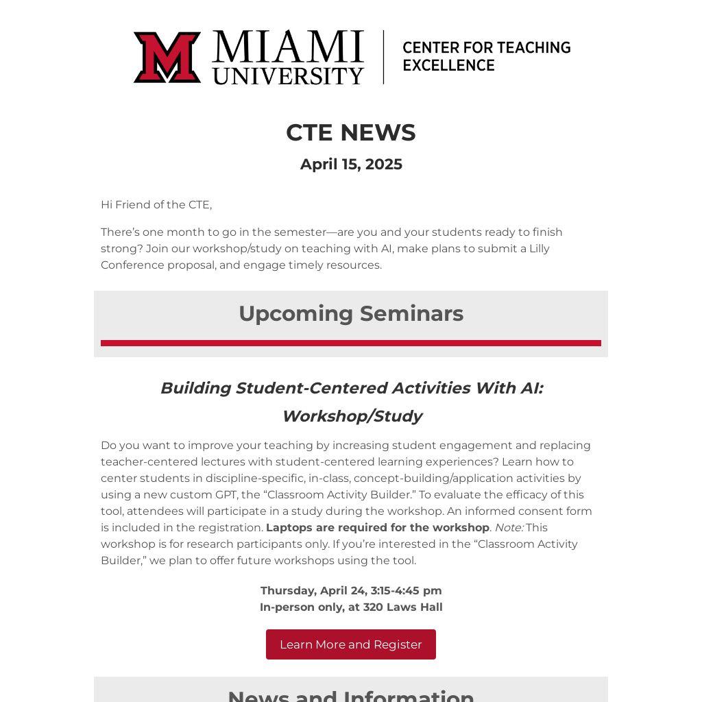 The Institutional Effectiveness-Teaching Connection is a collaborative product of the Office of Institutional Research and Effectiveness and the CTE, whose goal is to translate institutional data into considerations for improving teaching and learning at Miami. The latest issue (No. 118) focuses on “Closing the Assessment Loop.”