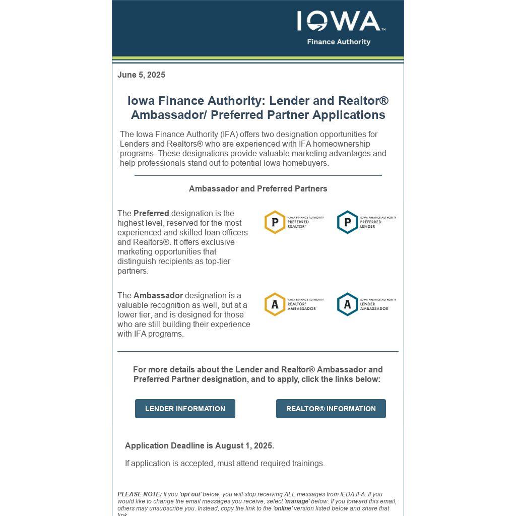 Iowa Finance Authority: Lender and Realtor® Ambassador/ Preferred Partner Applications |