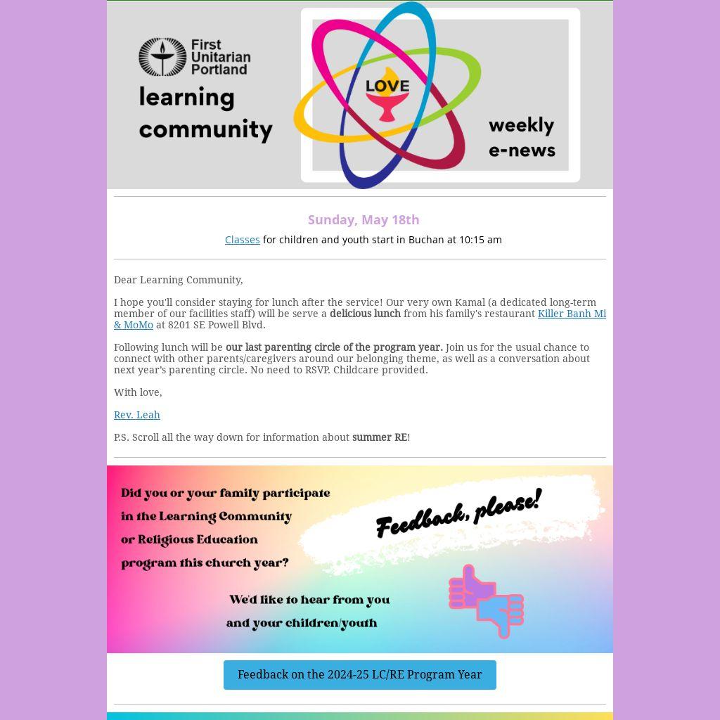 Parenting Circle, RE feedback, Bridging, volunteer thanks, and more