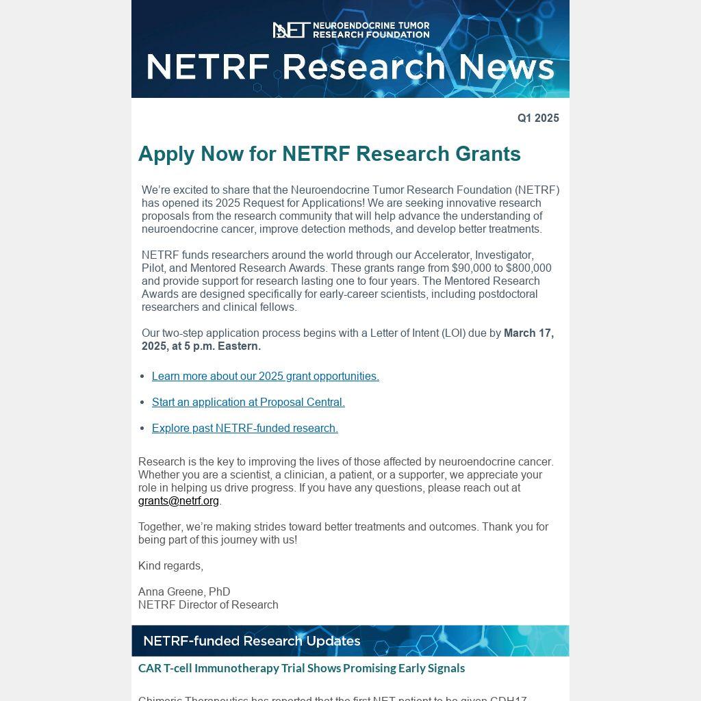 Research is the key to improving the lives of those affected by neuroendocrine cancer. Whether you are a scientist, a clinician, a patient, or a supporter, we appreciate your role in helping us drive progress. If you have any questions, please reach out at grants@netrf.org.