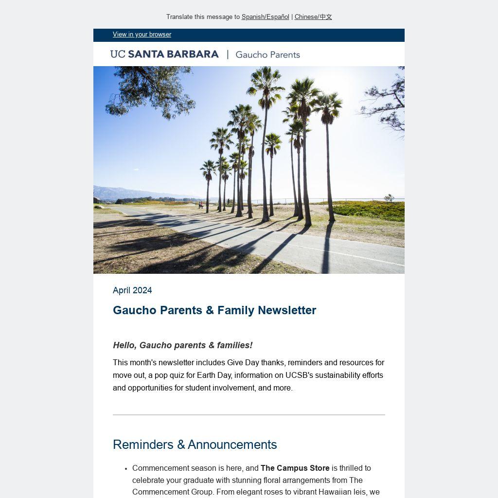 This month's newsletter includes Give Day thanks, reminders and resources for move out, a pop quiz for Earth Day, information on UCSB's sustainability efforts and opportunities for student involvement, and more.