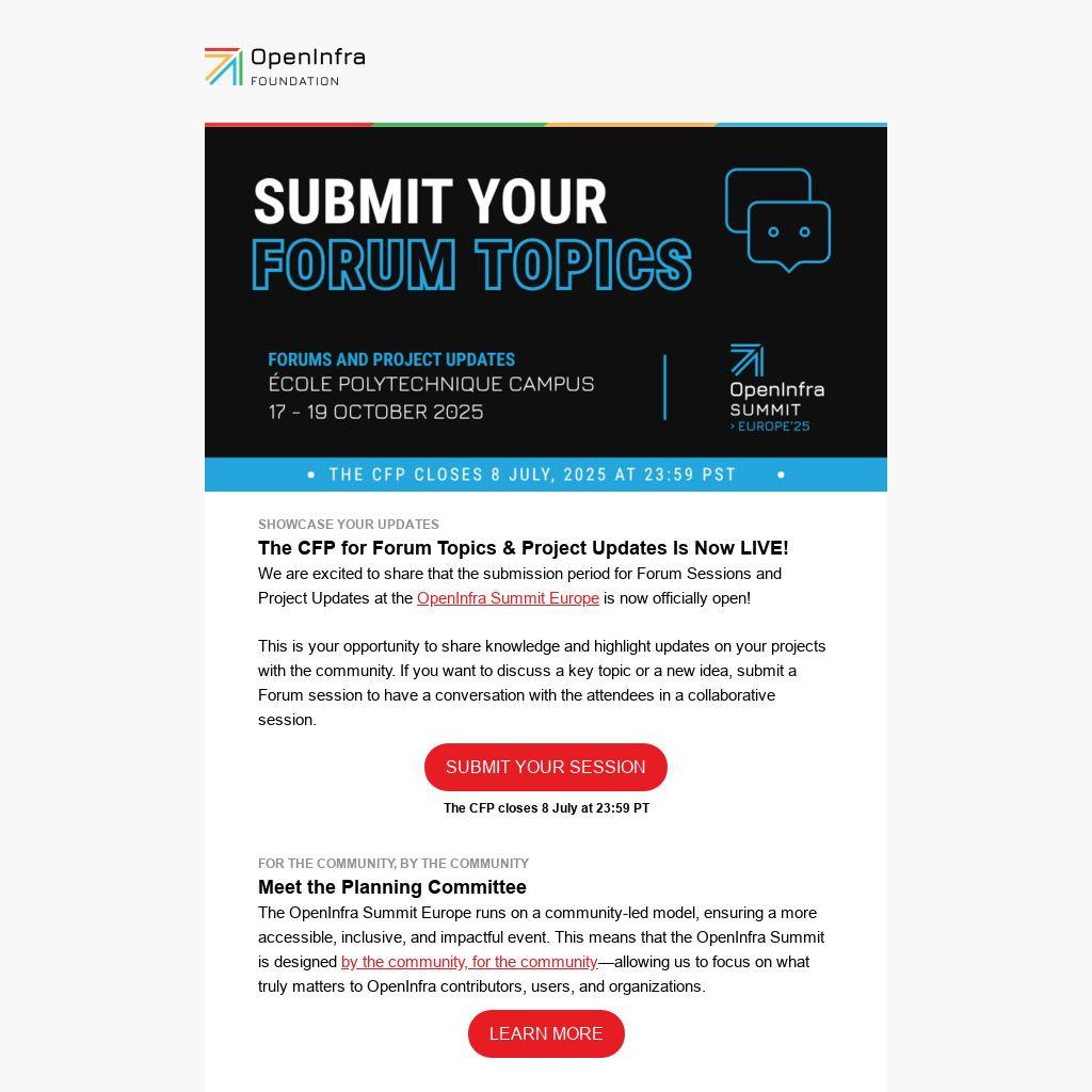 We are excited to share that the submission period for Forum Sessions and Project Updates at the OpenInfra Summit Europe is now officially open!