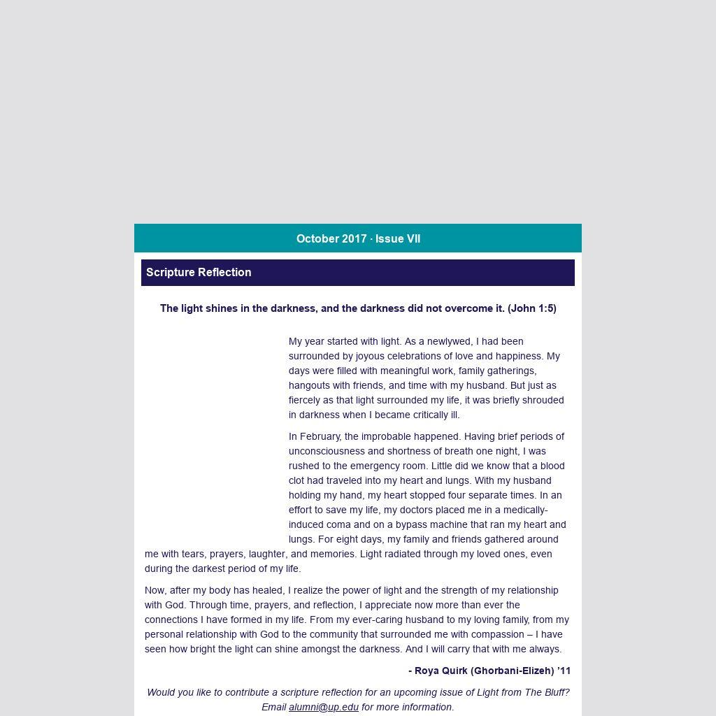What is one way you see God’s light in everyday life? Our students face many challenges. I often see God’s grace working in their lives as they face these challenges during their formative years at college.
