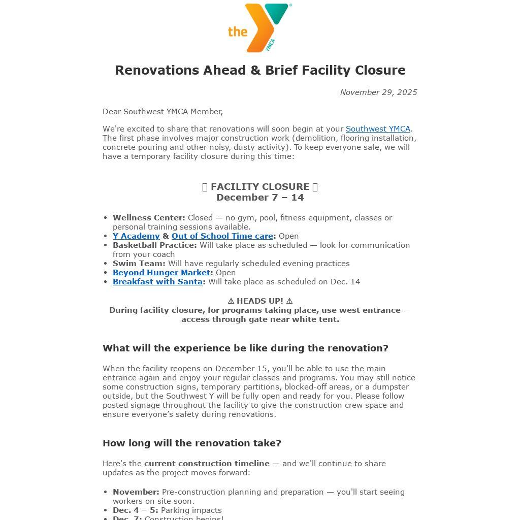 Thank you for your patience and support — these improvements are all about creating a better experience for you and our community. We can't wait to welcome you into a refreshed, more inclusive Southwest YMCA.