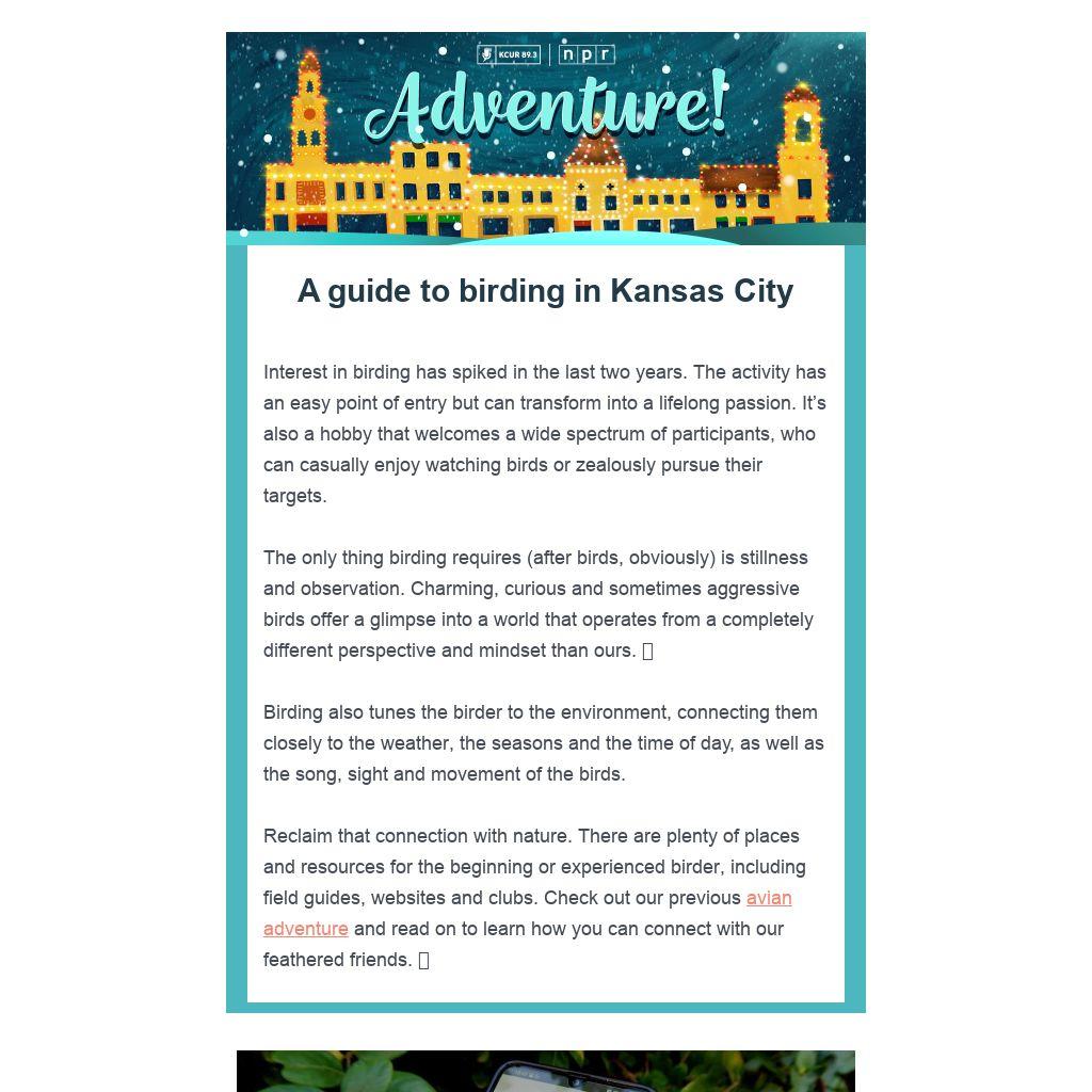 Not sure where to start? KC Birding Walks shares likely birding locations, organized by region, and some of the types of birds you might see in that area.