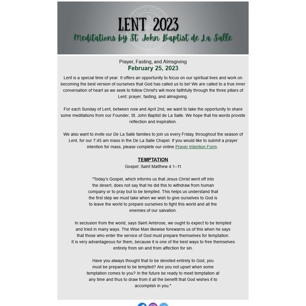 We also want to invite our De La Salle families to join us every Friday, throughout the season of Lent, for our 7:45 am mass in the De La Salle Chapel. If you would like to submit a prayer intention for mass, please complete our online Prayer Intention Form.