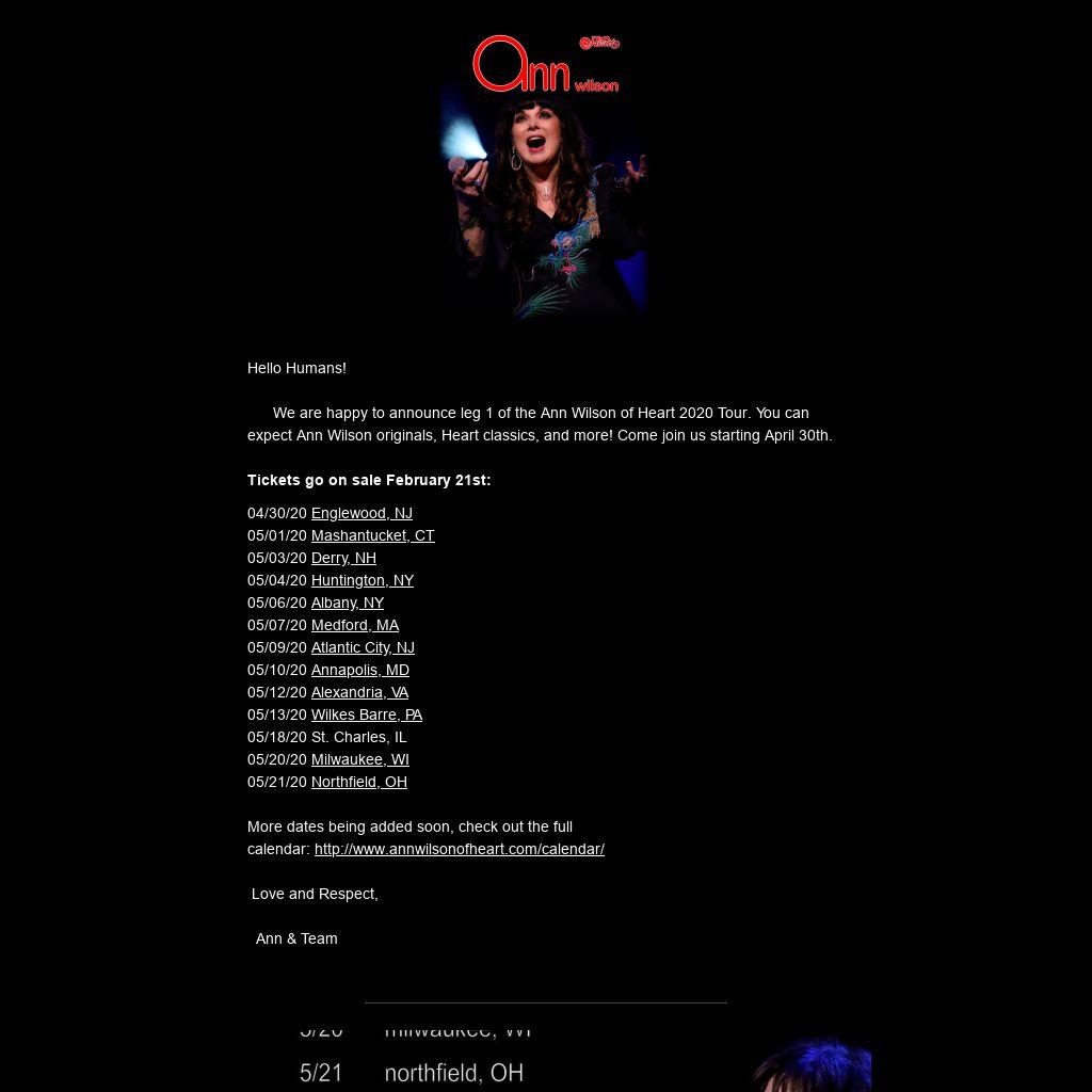 We are happy to announce leg 1 of the Ann Wilson of Heart 2020 Tour. You can expect Ann Wilson originals, Heart classics, and more! Come join us starting April 30th.