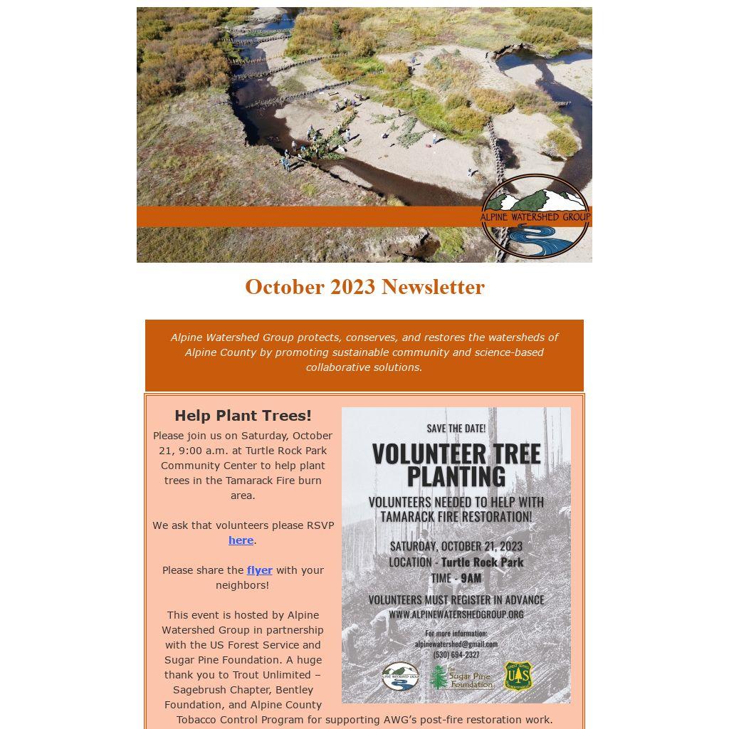 Ways to Connect or HelpWe always love to hear from our watershed community! Below are email links to reach AWG's staff, or reach us at AWG's office at (530) 694-2327. Please follow us on Facebook and Instagram, and subscribe to our YouTube channel.