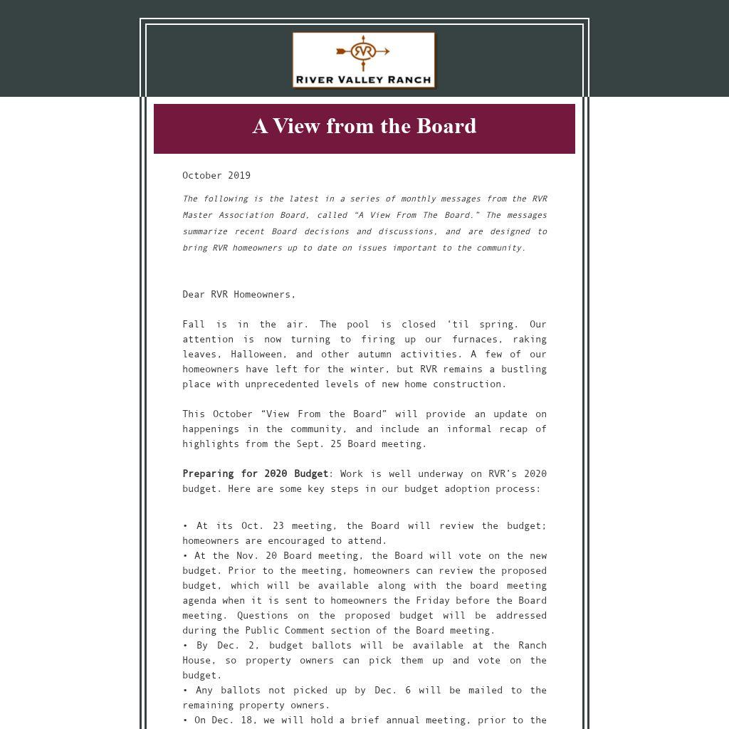 The following is the latest in a series of monthly messages from the RVR Master Association Board, called “A View From The Board.” The messages summarize recent Board decisions and discussions, and are designed to bring RVR homeowners up to date on issues important to the community.