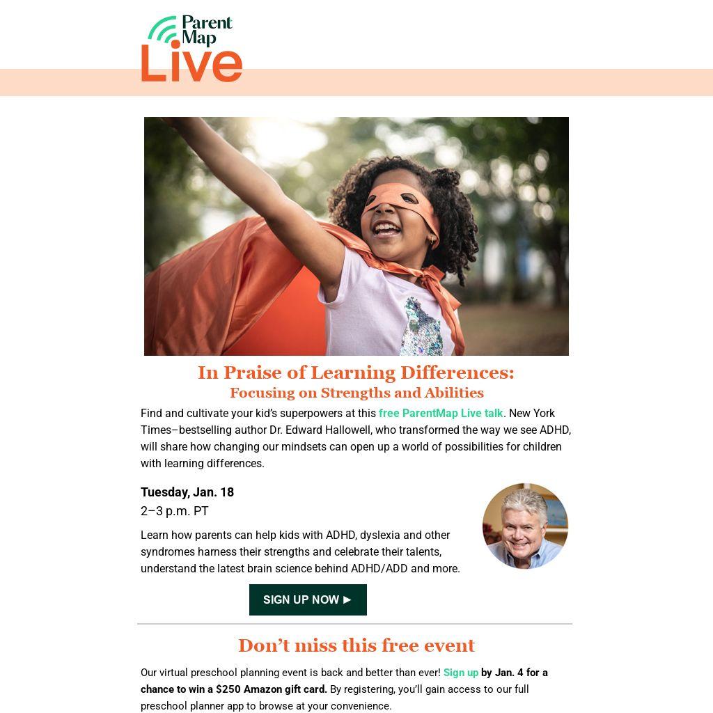 Find and cultivate your kid’s superpowers at this free ParentMap Live talk. New York Times–bestselling author Dr. Edward Hallowell, who transformed the way we see ADHD, will share how changing our mindsets can open up a world of possibilities for children with learning differences.