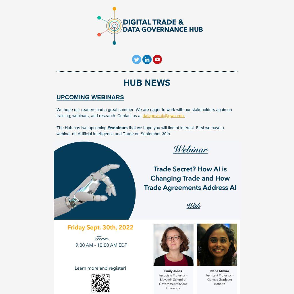 The Hub has two upcoming #webinars that we hope you will find of interest. First we have a webinar on Artificial Intelligence and Trade on September 30th.