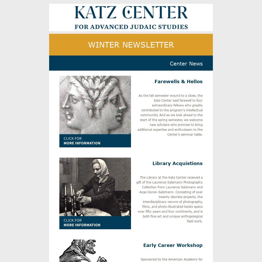 As the fall semester wound to a close, the Katz Center said farewell to four extraordinary fellows who greatly contributed to the program's intellectual community. And as we look ahead to the start of the spring semester, we welcome new scholars who promise to bring additional expertise and enthusiasm to the Center's seminar table.