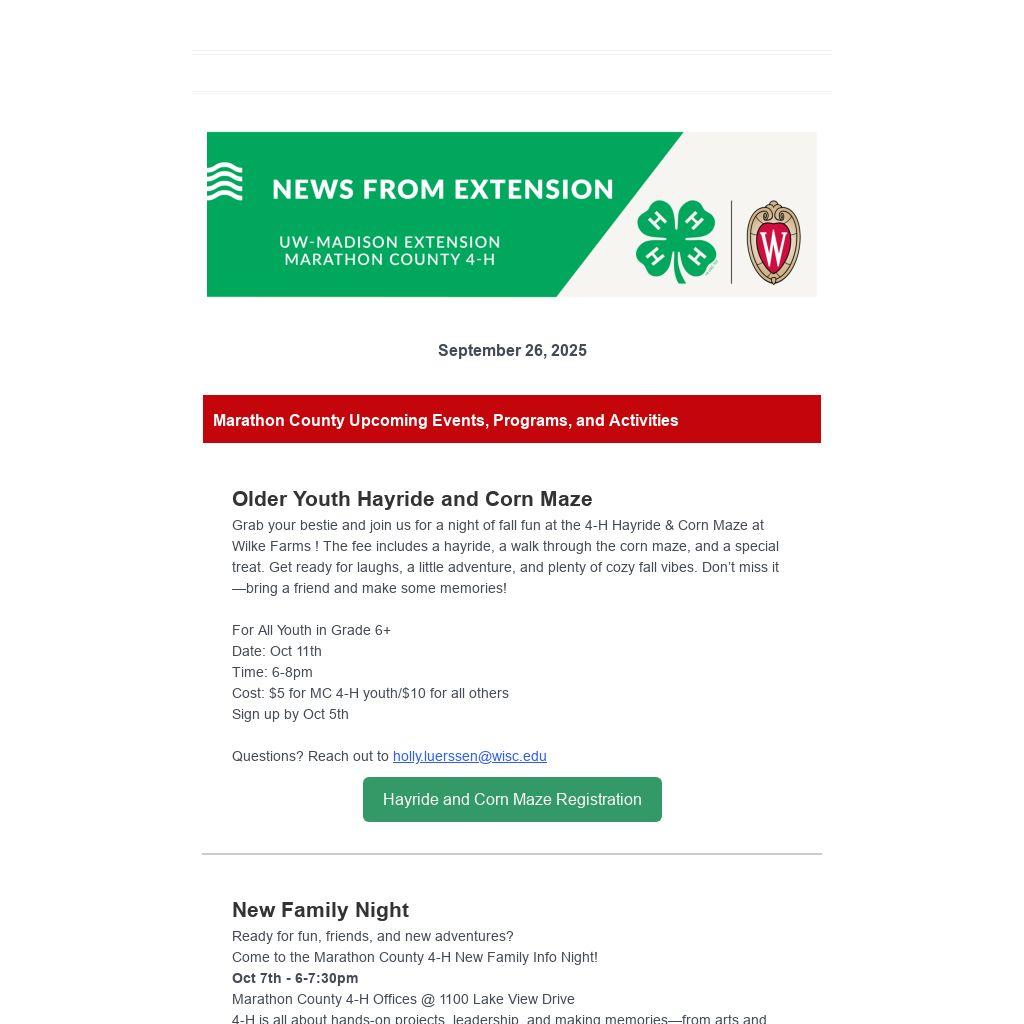 Ready for fun, friends, and new adventures? Come to the Marathon County 4-H New Family Info Night! Oct 7th - 6-7:30pm Marathon County 4-H Offices @ 1100 Lake View Drive 4-H is all about hands-on projects, leadership, and making memories—from arts and foods to animals, STEM, and more! Bring your family and see how YOU can be part of the Marathon County 4-H crew! Everyone’s welcome—come find your place in 4-H! Sign Up by September 30th