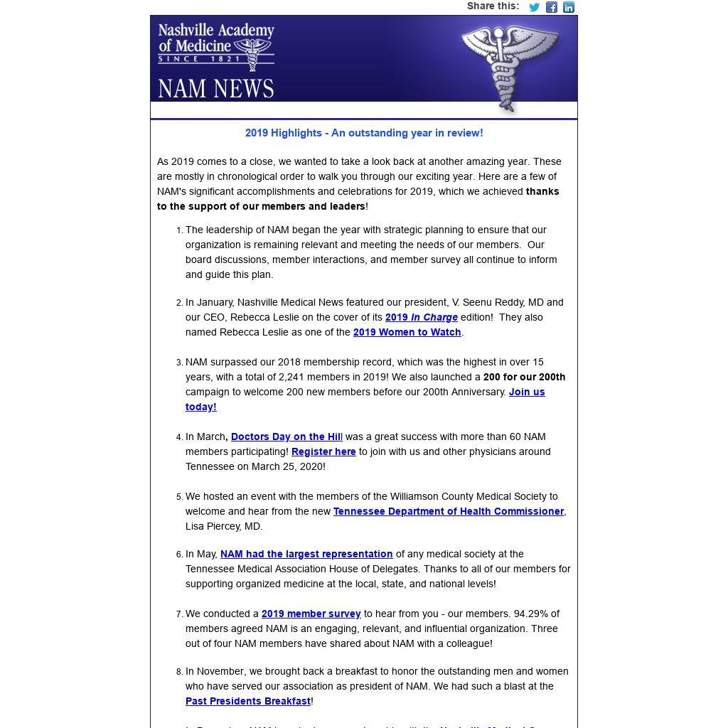 - In December, NAM launched a new partnership with the Nashville Medical Group Management Association to better serve our physician members and their practice managers.
