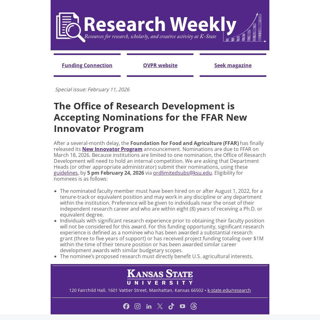 After a several-month delay, the Foundation for Food and Agriculture (FFAR) has finally released its New Innovator Program announcement. Nominations are due to FFAR on March 18, 2026. Because institutions are limited to one nomination, the Office of Research Development will need to hold an internal competition. We are asking that Department Heads (or other appropriate administrator) submit their nominations, using these guidelines, by 5 pm February 24, 2026 via ordlimitedsubs@ksu.edu. Eligibility for nominees is as follows: