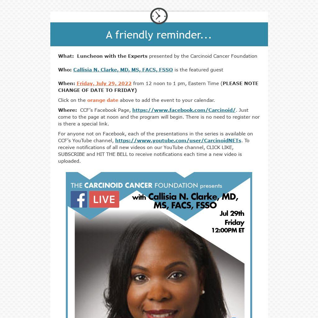 Where:  CCF’s Facebook Page, https://www.facebook.com/Carcinoid/. Just come to the page at noon and the program will begin. There is no need to register nor is there a special link.