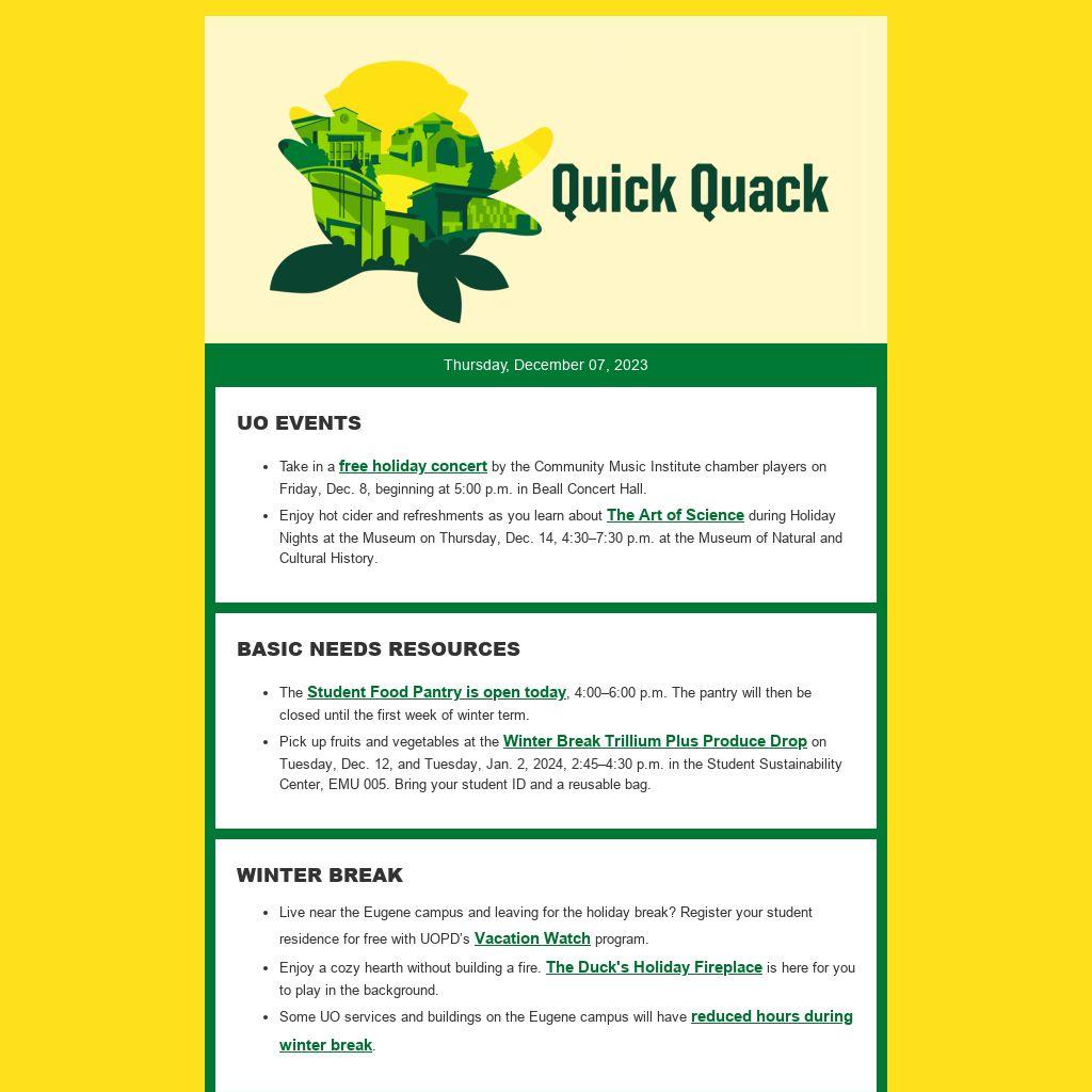 Live near the Eugene campus and leaving for the holiday break? Register your student residence for free with UOPD’s Vacation Watch program.