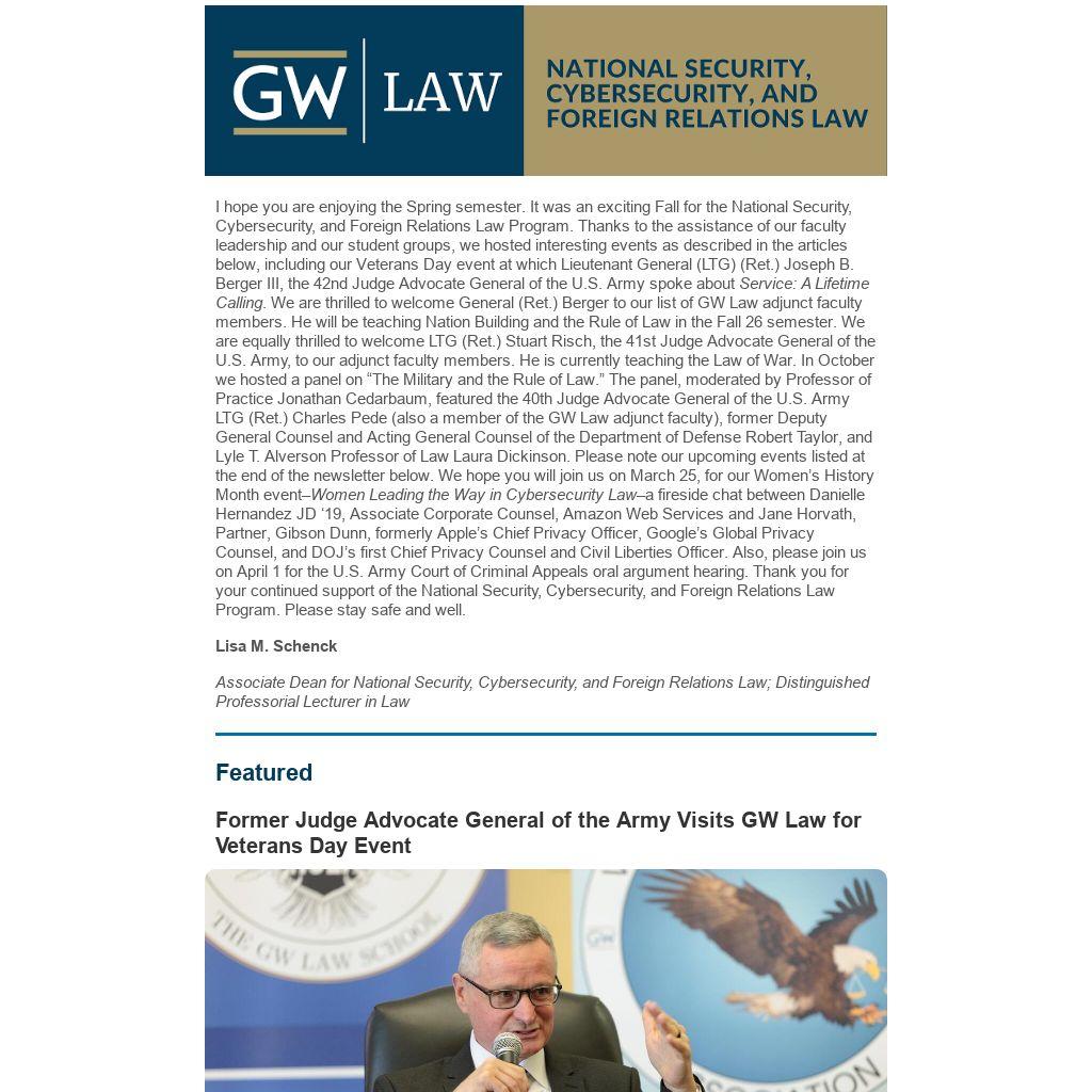 I hope you are enjoying the Spring semester. It was an exciting Fall for the National Security, Cybersecurity, and Foreign Relations Law Program. Thanks to the assistance of our faculty leadership and our student groups, we hosted interesting events as described in the articles below, including our Veterans Day event at which Lieutenant General (LTG) (Ret.) Joseph B. Berger III, the 42nd Judge Advocate General of the U.S. Army spoke about Service: A Lifetime Calling. We are thrilled to welcome General (Ret.) Berger to our list of GW Law adjunct faculty members. He will be teaching Nation Building and the Rule of Law in the Fall 26 semester. We are equally thrilled to welcome LTG (Ret.) Stuart Risch, the 41st Judge Advocate General of the U.S. Army, to our adjunct faculty members. He is currently teaching the Law of War. In October we hosted a panel on “The Military and the Rule of Law.” The panel, moderated by Professor of Practice Jonathan Cedarbaum, featured the 40th Judge Advocate General of the U.S. Army LTG (Ret.) Charles Pede (also a member of the GW Law adjunct faculty), former Deputy General Counsel and Acting General Counsel of the Department of Defense Robert Taylor, and Lyle T. Alverson Professor of Law Laura Dickinson. Please note our upcoming events listed at the end of the newsletter below. We hope you will join us on March 25, for our Women’s History Month event–Women Leading the Way in Cybersecurity Law–a fireside chat between Danielle Hernandez JD ‘19, Associate Corporate Counsel, Amazon Web Services and Jane Horvath, Partner, Gibson Dunn, formerly Apple’s Chief Privacy Officer, Google’s Global Privacy Counsel, and DOJ’s first Chief Privacy Counsel and Civil Liberties Officer. Also, please join us on April 1 for the U.S. Army Court of Criminal Appeals oral argument hearing. Thank you for your continued support of the National Security, Cybersecurity, and Foreign Relations Law Program. Please stay safe and well.