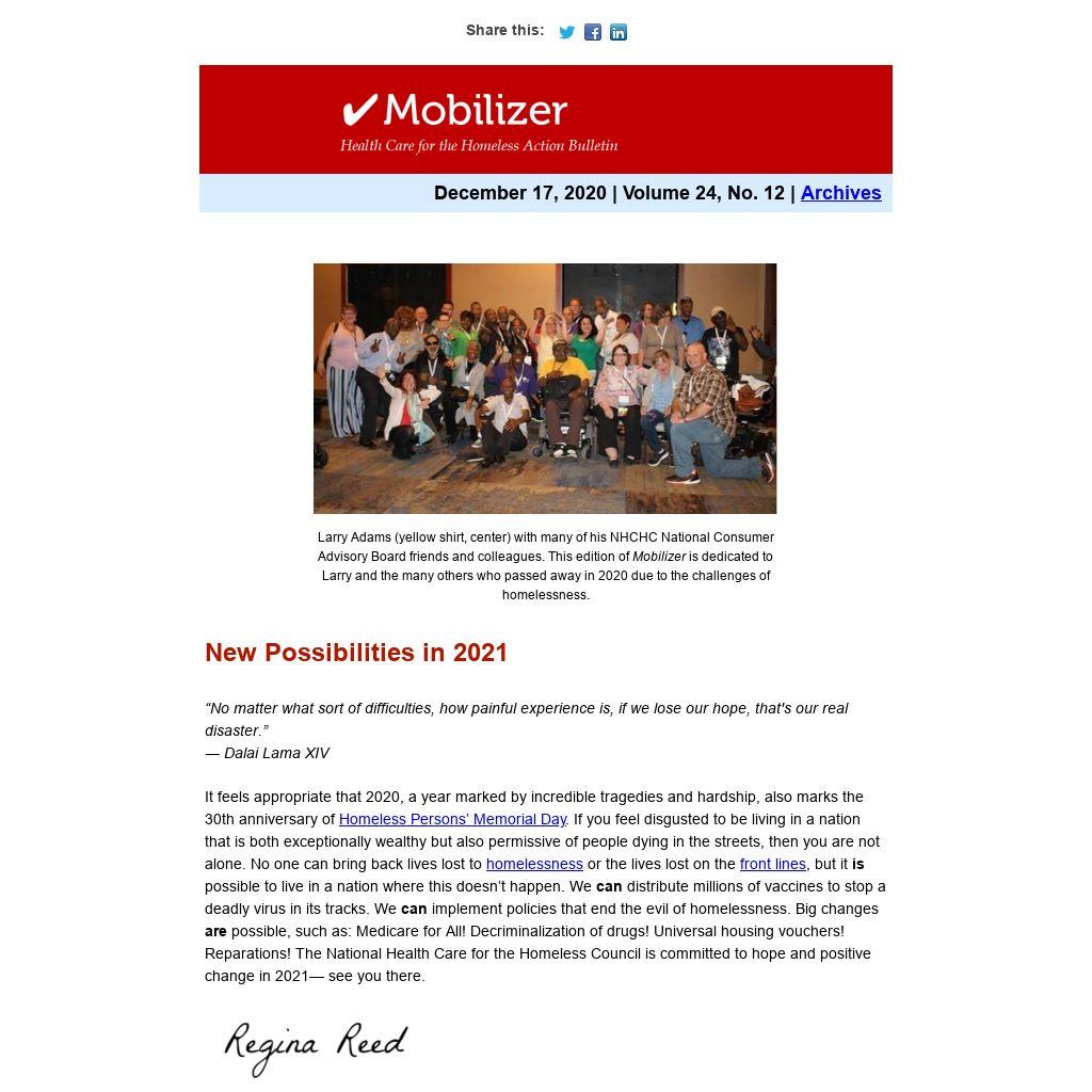Larry Adams (yellow shirt, center) with many of his NHCHC National Consumer Advisory Board friends and colleagues. This edition of Mobilizer is dedicated to Larry and the many others who passed away in 2020 due to the challenges of homelessness.