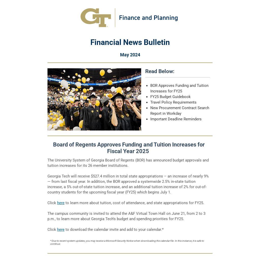 The campus community is invited to attend the A&F Virtual Town Hall on June 21, from 2 to 3 p.m., to learn more about Georgia Tech’s budget and spending priorities for FY25.