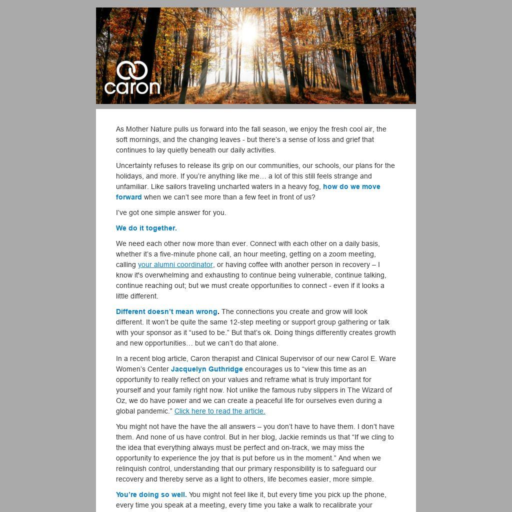 In a recent blog article, Caron therapist and Clinical Supervisor of our new Carol E. Ware Women’s Center Jacquelyn Guthridge encourages us to “view this time as an opportunity to really reflect on your values and reframe what is truly important for yourself and your family right now. Not unlike the famous ruby slippers in The Wizard of Oz, we do have power and we can create a peaceful life for ourselves even during a global pandemic.” Click here to read the article.