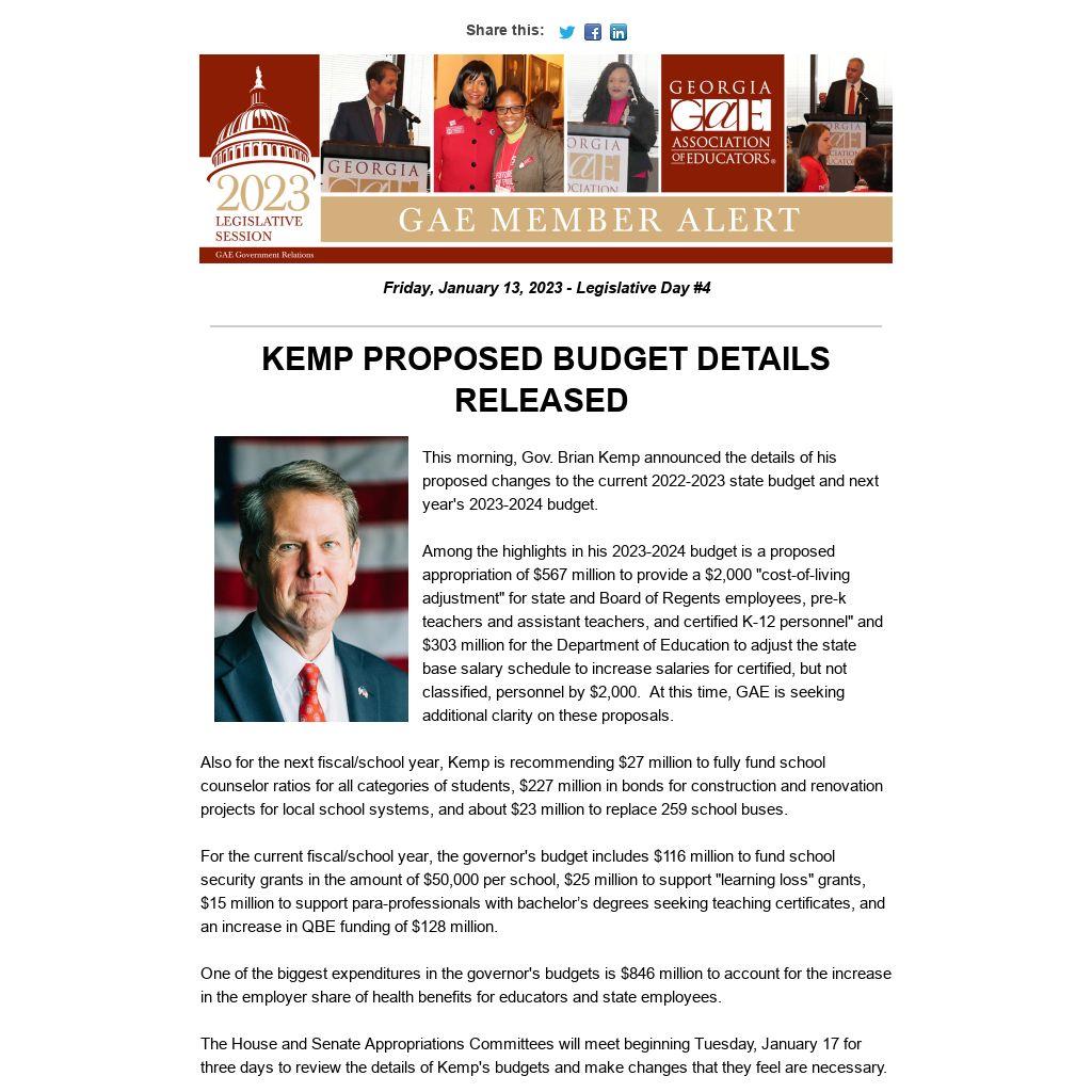 Among the highlights in his 2023-2024 budget is a proposed appropriation of $567 million to provide a $2,000 "cost-of-living adjustment" for state and Board of Regents employees, pre-k teachers and assistant teachers, and certified K-12 personnel" and $303 million for the Department of Education to adjust the state base salary schedule to increase salaries for certified, but not classified, personnel by $2,000. At this time, GAE is seeking additional clarity on these proposals.