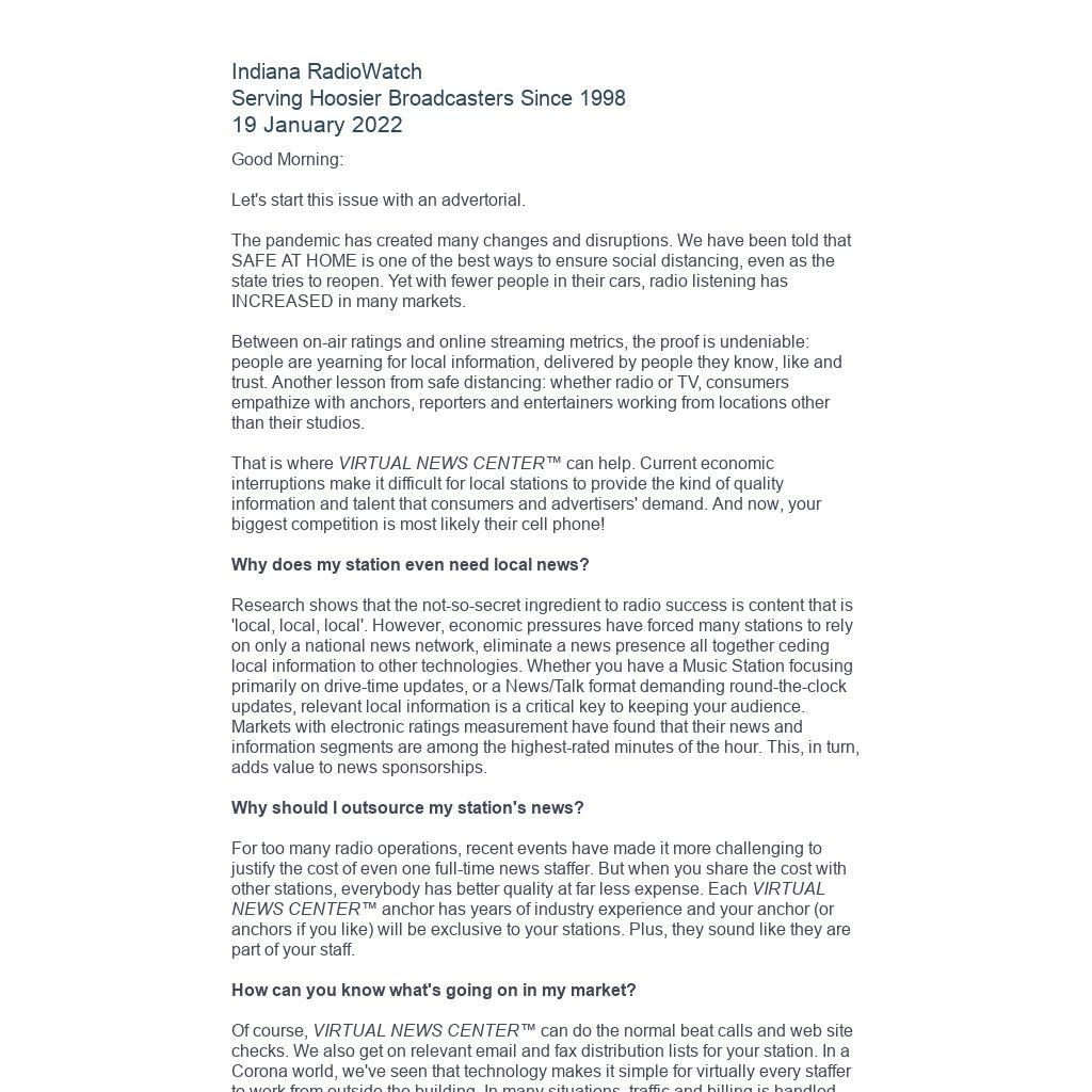 Indiana RadioWatch subscriptions are free. To subscribe, send an e-mail to irw@well.com and we'll add you. After publication, we archive Indiana RadioWatch on the Indiana Radio Archive at indianaradio.net. Please e-mail us your news stories and employment opportunities.