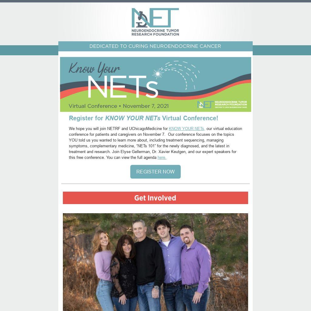 We hope you will join NETRF and UChicagoMedicine for KNOW YOUR NETs, our virtual education conference for patients and caregivers on November 7. Our conference focuses on the topics YOU told us you wanted to learn more about, including treatment sequencing, managing symptoms, complementary medicine, “NETs 101” for the newly diagnosed, and the latest in treatment and research. Join Elyse Gellerman, Dr. Xavier Keutgen, and our expert speakers for this free conference. You can view the full agenda here.