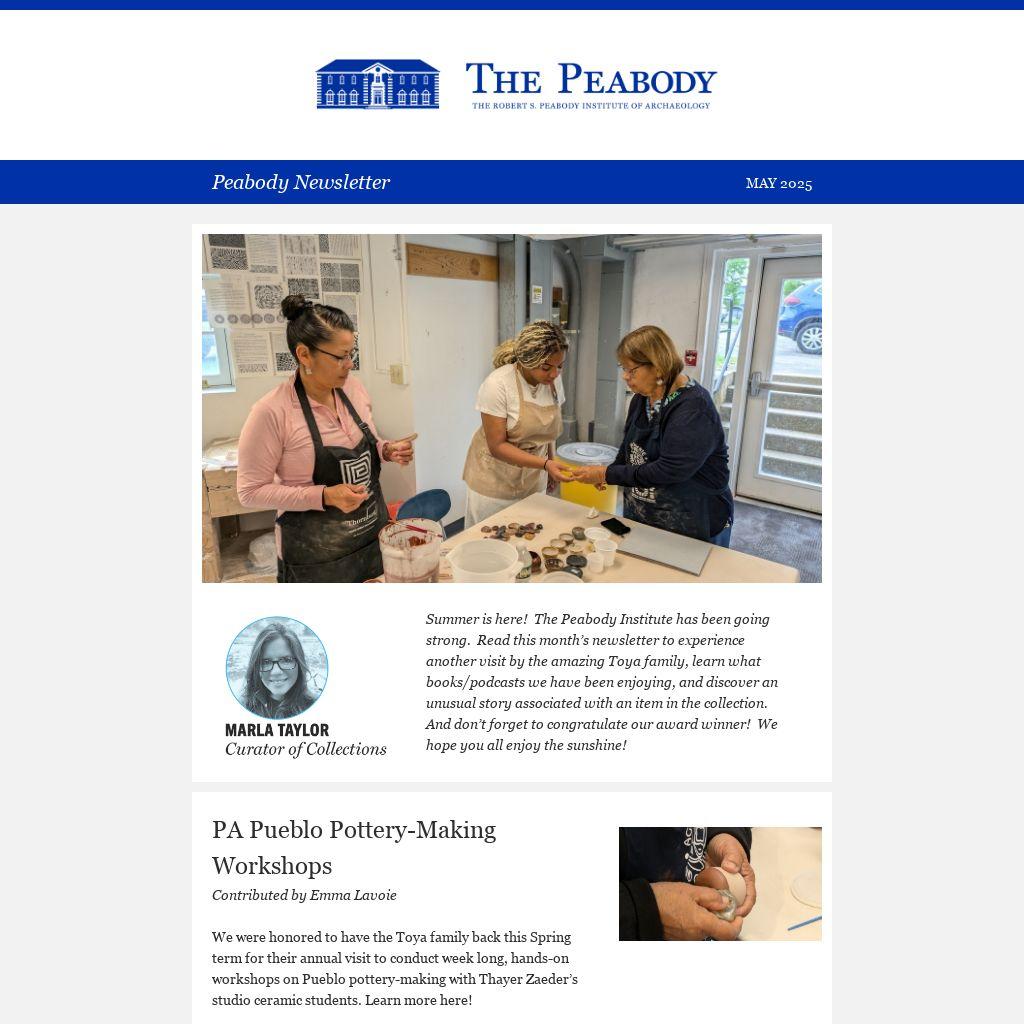 Summer is here! The Peabody Institute has been going strong. Read this month’s newsletter to experience another visit by the amazing Toya family, learn what books/podcasts we have been enjoying, and discover an unusual story associated with an item in the collection. And don’t forget to congratulate our award winner! We hope you all enjoy the sunshine!