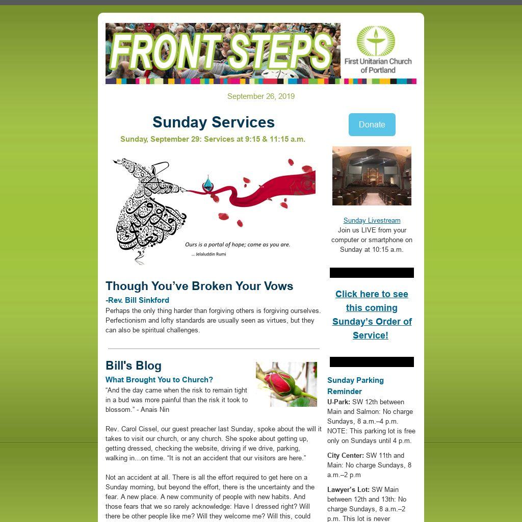 Do You Have an Item for E-news and/or the Sunday Bulletin?If you have an item you’d like published in our weekly Front Steps (eNews) or the Sunday Bulletin, please submit it to: