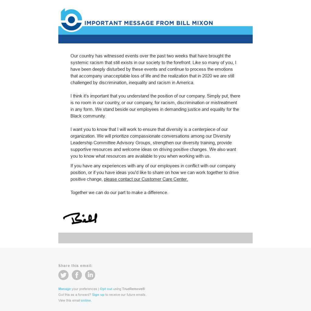I think it’s important that you understand the position of our company. Simply put, there is no room in our country, or our company, for racism, discrimination or mistreatment in any form. We stand beside our employees in demanding justice and equality for the Black community.