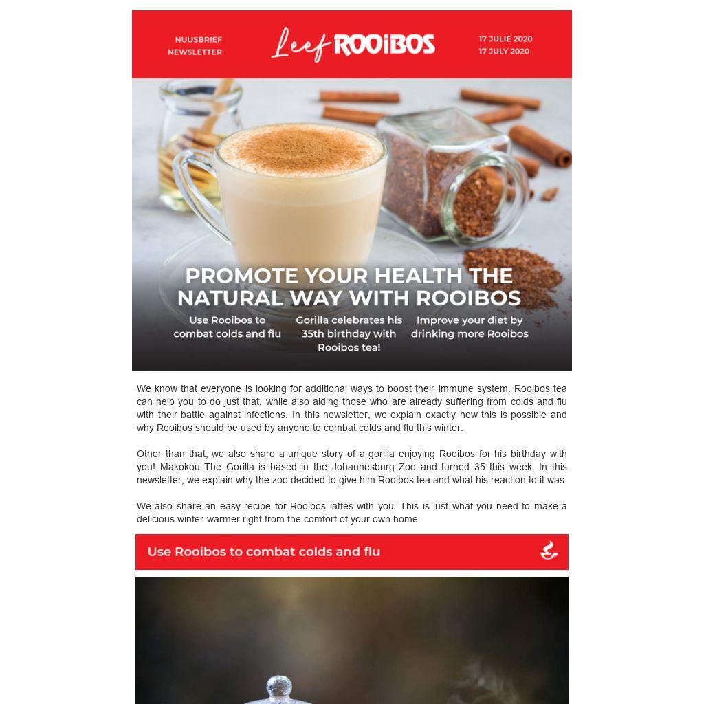 We know that everyone is looking for additional ways to boost their immune system. Rooibos tea can help you to do just that, while also aiding those who are already suffering from colds and flu with their battle against infections. In this newsletter, we explain exactly how this is possible and why Rooibos should be used by anyone to combat colds and flu this winter.