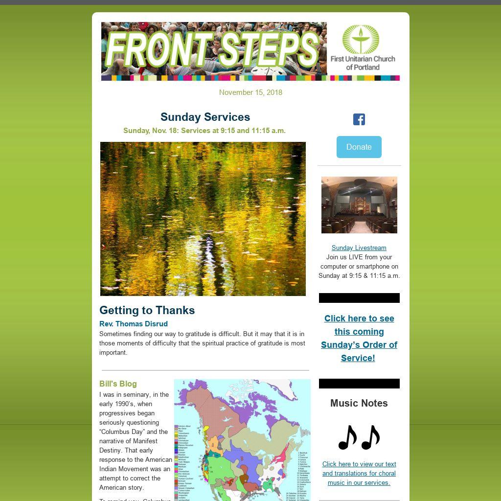 Do You Have an Item for E-news and/or the Sunday Bulletin?If you have an item you’d like published in our weekly Front Steps (eNews) or the Sunday Bulletin, please submit it to: