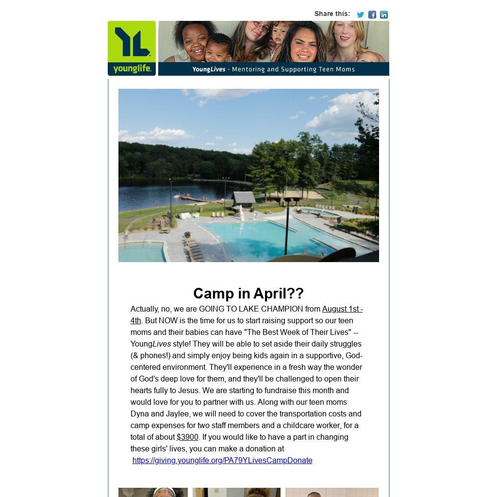 Actually, no, we are GOING TO LAKE CHAMPION from August 1st - 4th. But NOW is the time for us to start raising support so our teen moms and their babies can have "The Best Week of Their Lives" -- YoungLives style! They will be able to set aside their daily struggles (& phones!) and simply enjoy being kids again in a supportive, God-centered environment. They'll experience in a fresh way the wonder of God's deep love for them, and they'll be challenged to open their hearts fully to Jesus. We are starting to fundraise this month and would love for you to partner with us. Along with our teen moms Dyna and Jaylee, we will need to cover the transportation costs and camp expenses for two staff members and a childcare worker, for a total of about $3900. If you would like to have a part in changing these girls' lives, you can make a donation at https://giving.younglife.org/PA79YLivesCampDonate
