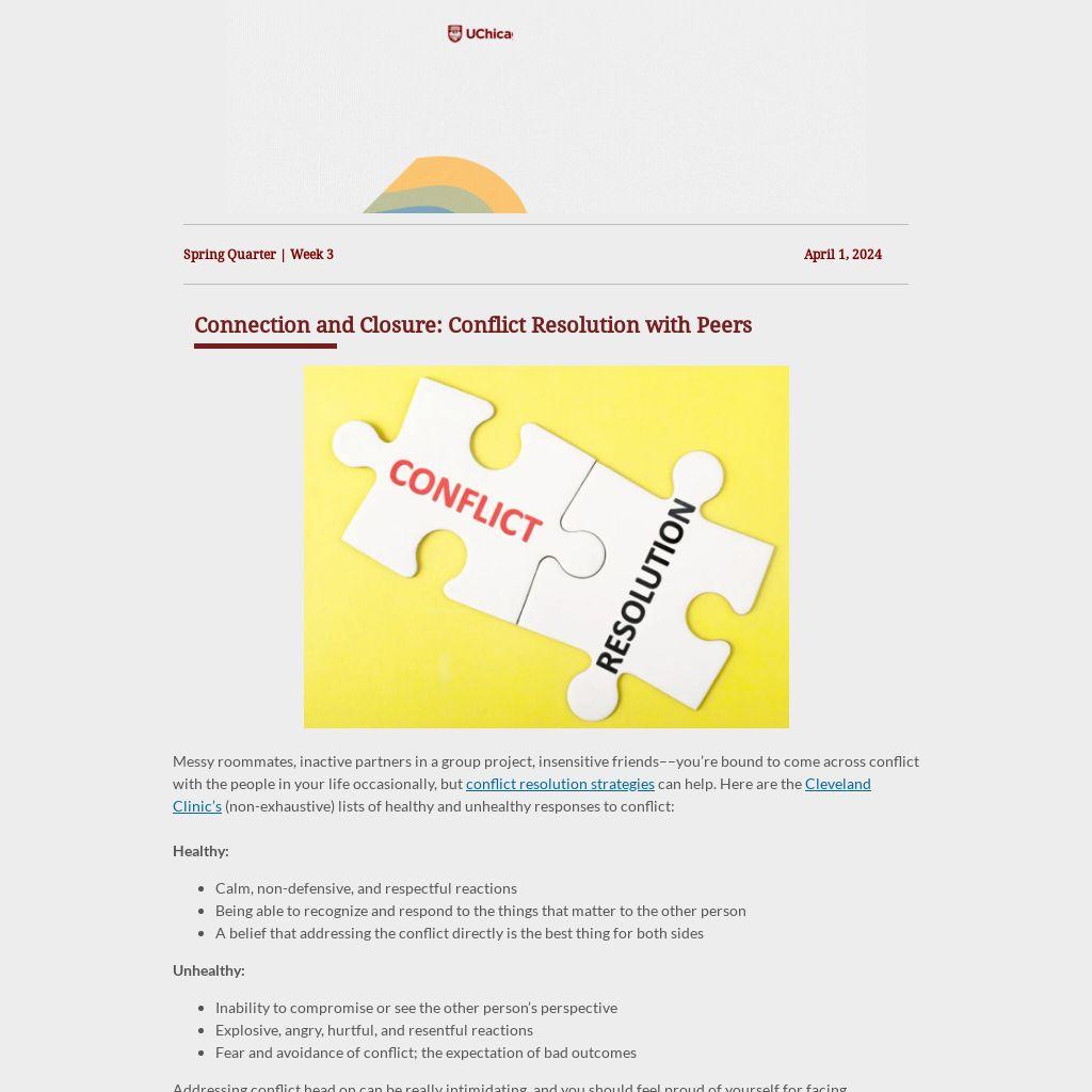 Messy roommates, inactive partners in a group project, insensitive friends––you’re bound to come across conflict with the people in your life occasionally, but conflict resolution strategies can help. Here are the Cleveland Clinic’s (non-exhaustive) lists of healthy and unhealthy responses to conflict: