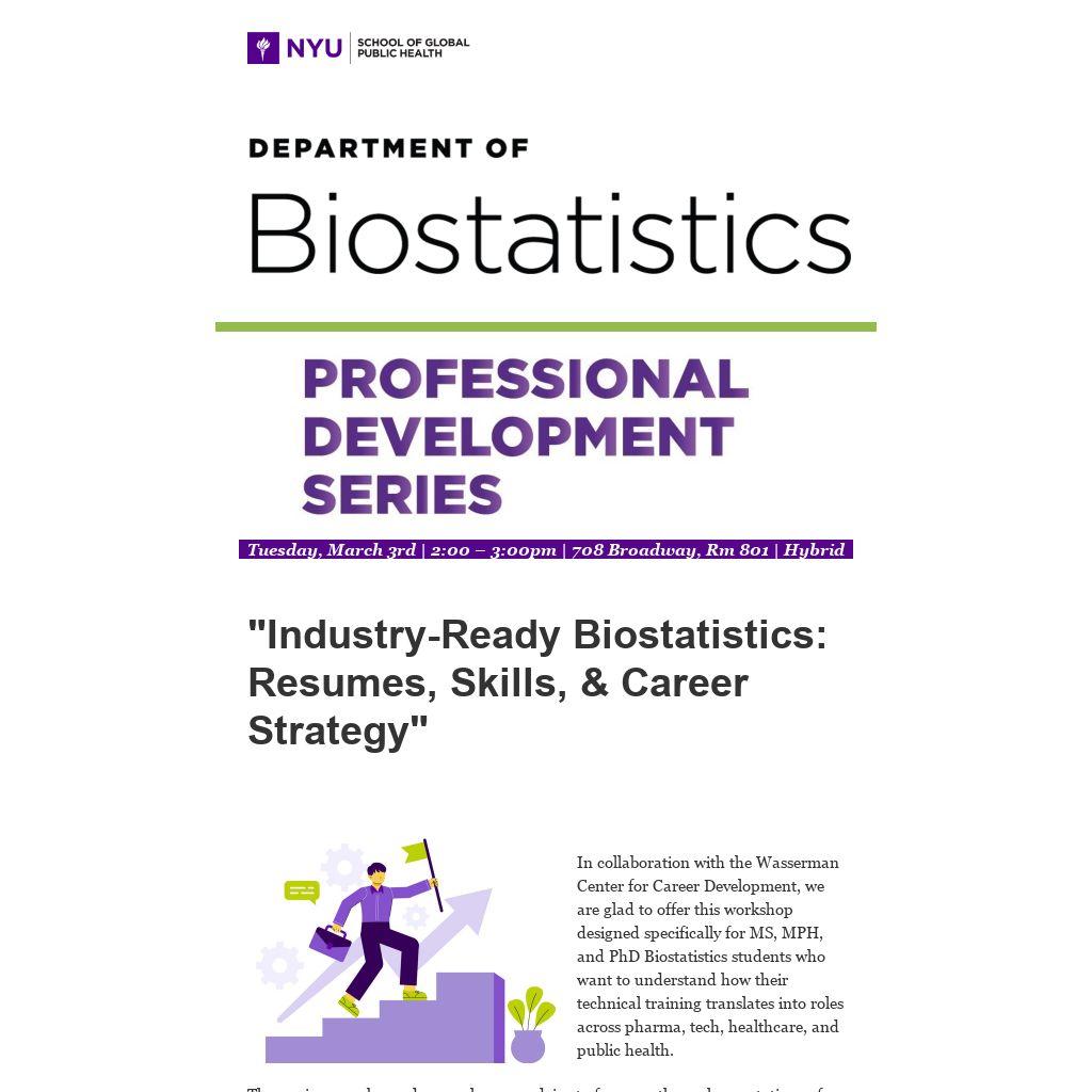 In collaboration with the Wasserman Center for Career Development, we are glad to offer this workshop designed specifically for MS, MPH, and PhD Biostatistics students who want to understand how their technical training translates into roles across pharma, tech, healthcare, and public health.